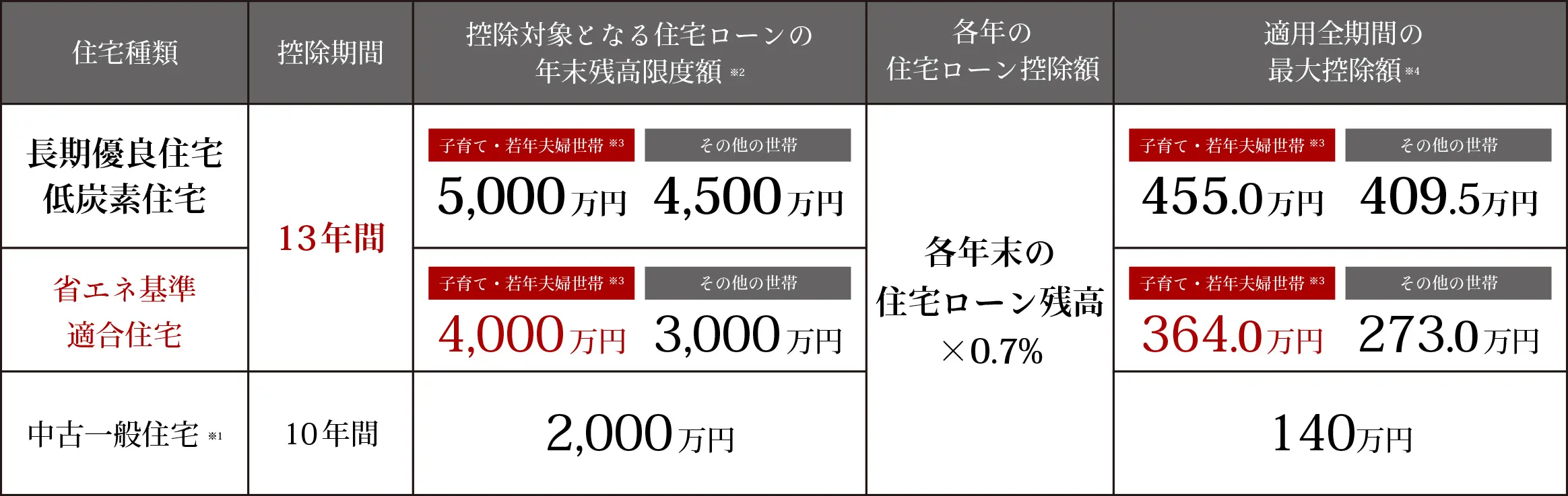 ※1.長期優良住宅・低炭素住宅、ZEH水準省エネ住宅、省エネ基準適合住宅以外の中古住宅 ※2.控除対象となる住宅ローン等の年末残高は、住宅の取得価格が限度になります。※3. 18際以下の扶養親族がいる、または自身か配偶者のいずれかが39歳以下の夫婦となる世帯対象。入居期限は2025年12月末までとなります。※4. 控除期間の最終年末のローン残高が、「控除対象となる住宅ローンの年末残高限度額」よりも多い場合。※住宅ローン控除の制度を利用する場合、面積等による諸条件があります。