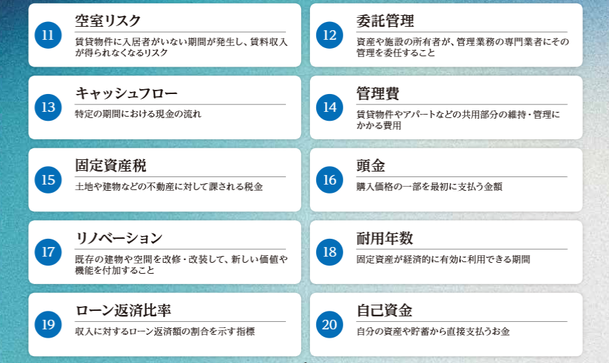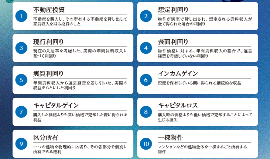初心者がつまずきやすい専門用語を、辞書のように調べながら使える形式でまとめた完全ガイド。不動産投資の理解をスムーズにする基礎知識を網羅した、手元に置いておきたい一冊です。