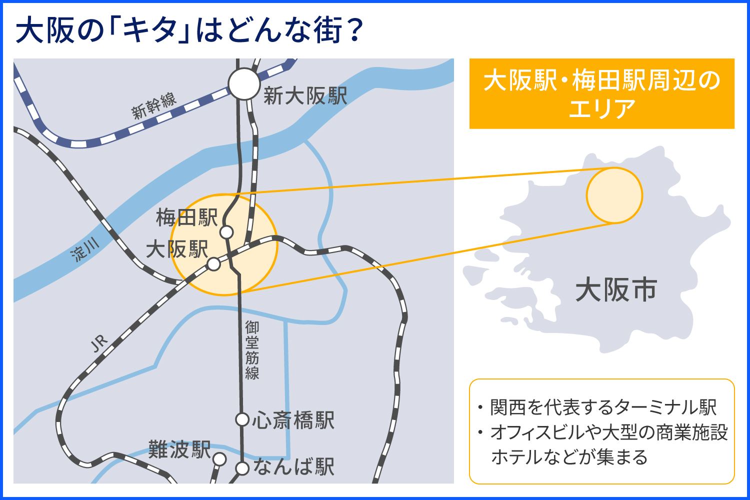 大阪では梅田周辺を「キタ」、道頓堀を中心とする心斎橋・難波エリアを「ミナミ」と呼ぶのが一般的です。これらは正式な地名ではありませんが、キタは主にJR大阪駅や各線の梅田駅周辺を指します。また北新地や堂島、中之島、茶屋町、中津、中崎町、西天満といった周辺エリアもキタとして扱われることが多いです。