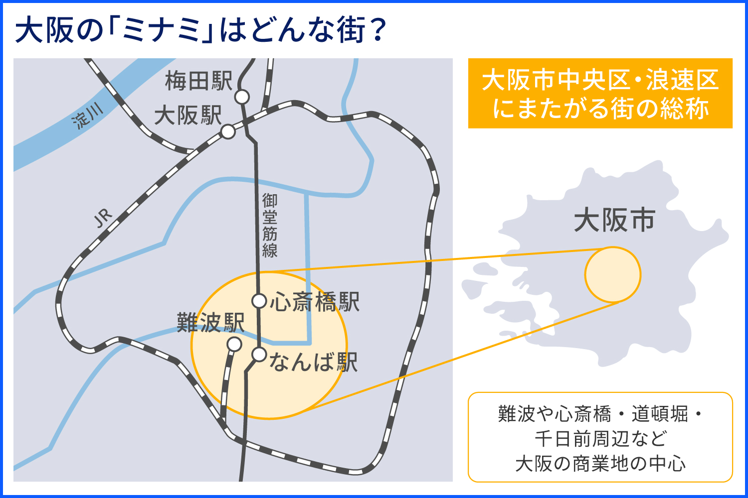 大阪でよく使われるエリアの呼び方に「キタ」と「ミナミ」があります。大阪駅周辺の梅田エリアが「キタ」と呼ばれるのに対し「ミナミ」は大阪市中央区から浪速区にかけて広がる地域のことです。