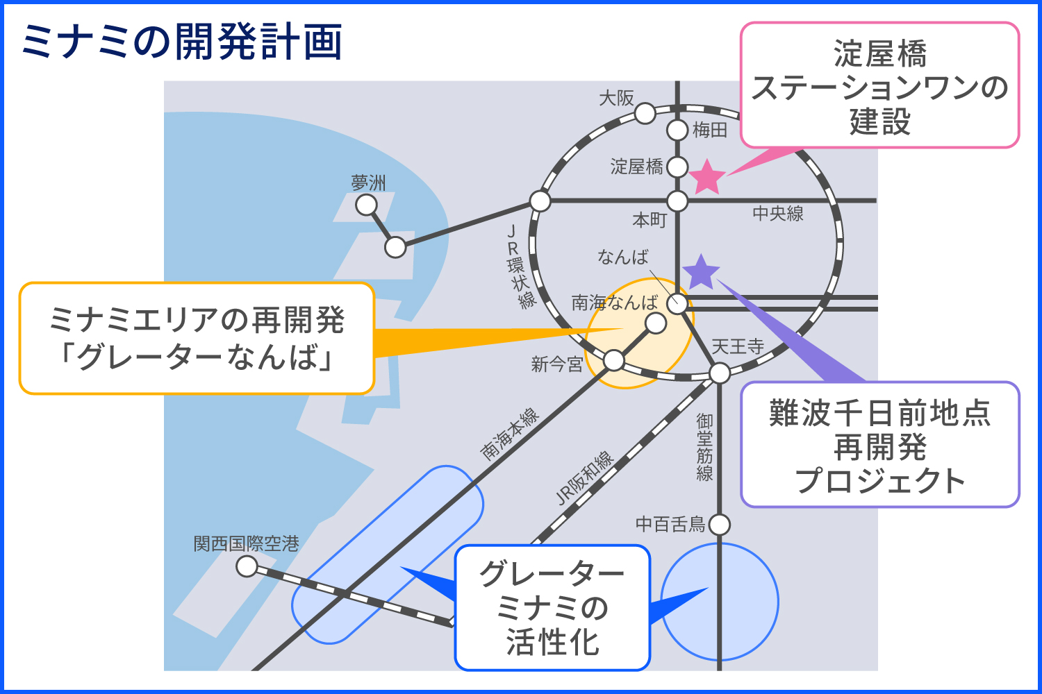 開発による将来性の高さも、ミナミが不動産投資先として人気を集めている理由です。ここからは、具体的にどのような開発プロジェクトが行われているのか見ていきましょう。