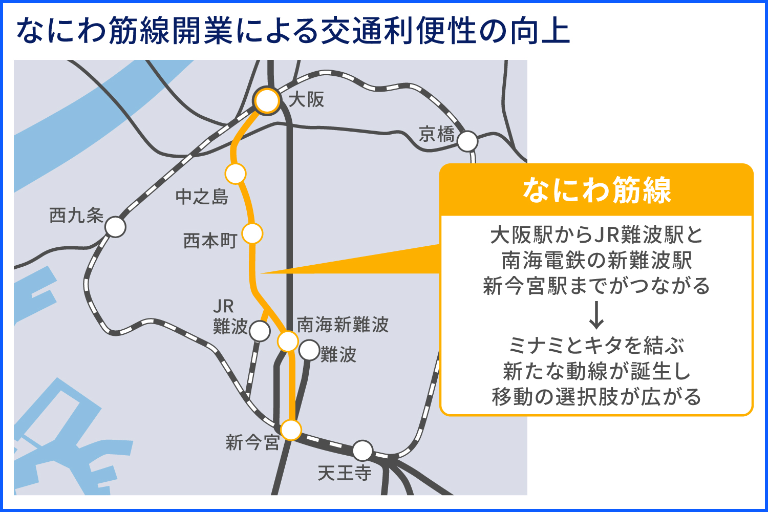 ミナミが不動産投資先として注目される理由の一つに、交通アクセスの向上が挙げられます。もともとミナミは複数の鉄道路線が集まるエリアで、大阪の中でも移動しやすい地域として知られています。加えて「なにわ筋線」が2031年春に開通すれば、大阪駅から中之島、西本町を経由し、JR難波駅や南海電鉄の新難波駅(仮称)、新今宮駅方面までつながる見込みです(※)。